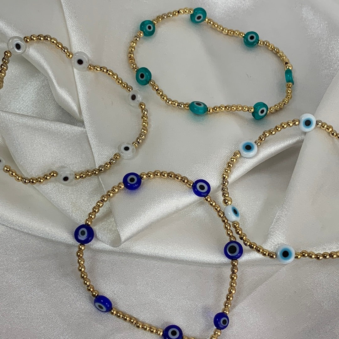 Incluye: Hilo elástico, bolitas de chapa de oro y ojitos del color elegido + bolsita de regalo.